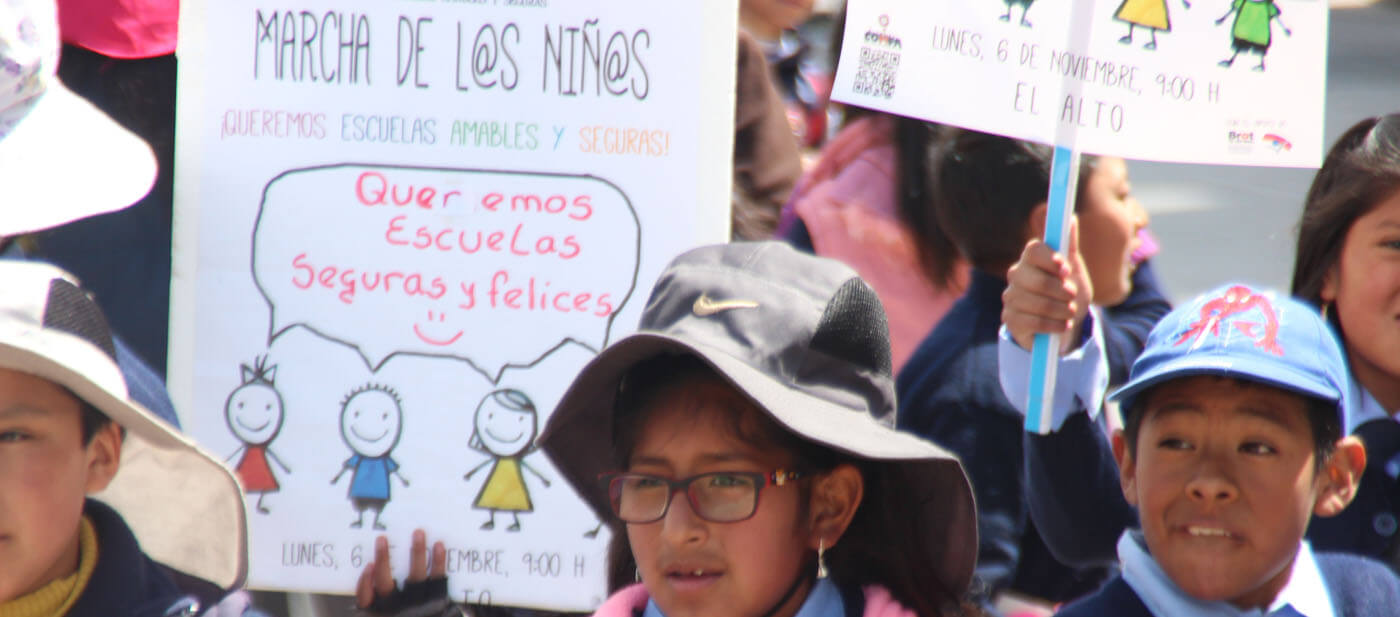 Ayer marcharon en Ciudad Satélite, El Alto, más que 1.000 Niños de 15 colegios de El Alto y Achocalla (Bolivia). Las Unidades Educativas están en el proceso de adherirse a la Red de Escuelas Amables y Seguras. Las niñas/os se prepararon con banners, afiches para visualizar demandas para sus Escuelas.