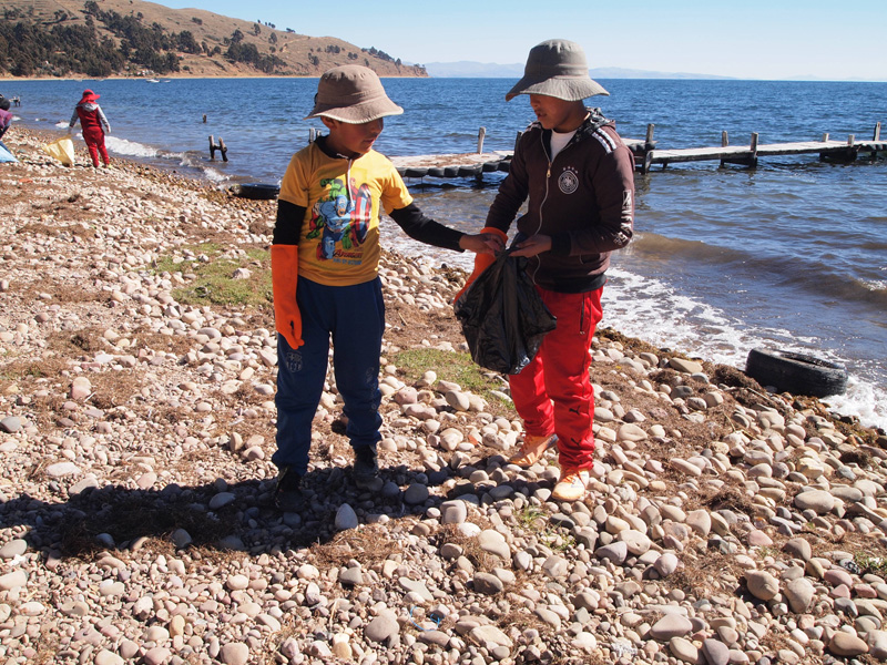 El sábado 23 de junio, niños/as y padres de 3 unidades educativas de la Red de Escuelas Amables y Seguras, Mamás de la casa cultural del Distrito 4 de COMPA, y activistas por la niñez, llegaron desde El Alto para realizar una acción de limpieza de las playas del lindero Chaapampa del Lago Titicaca.