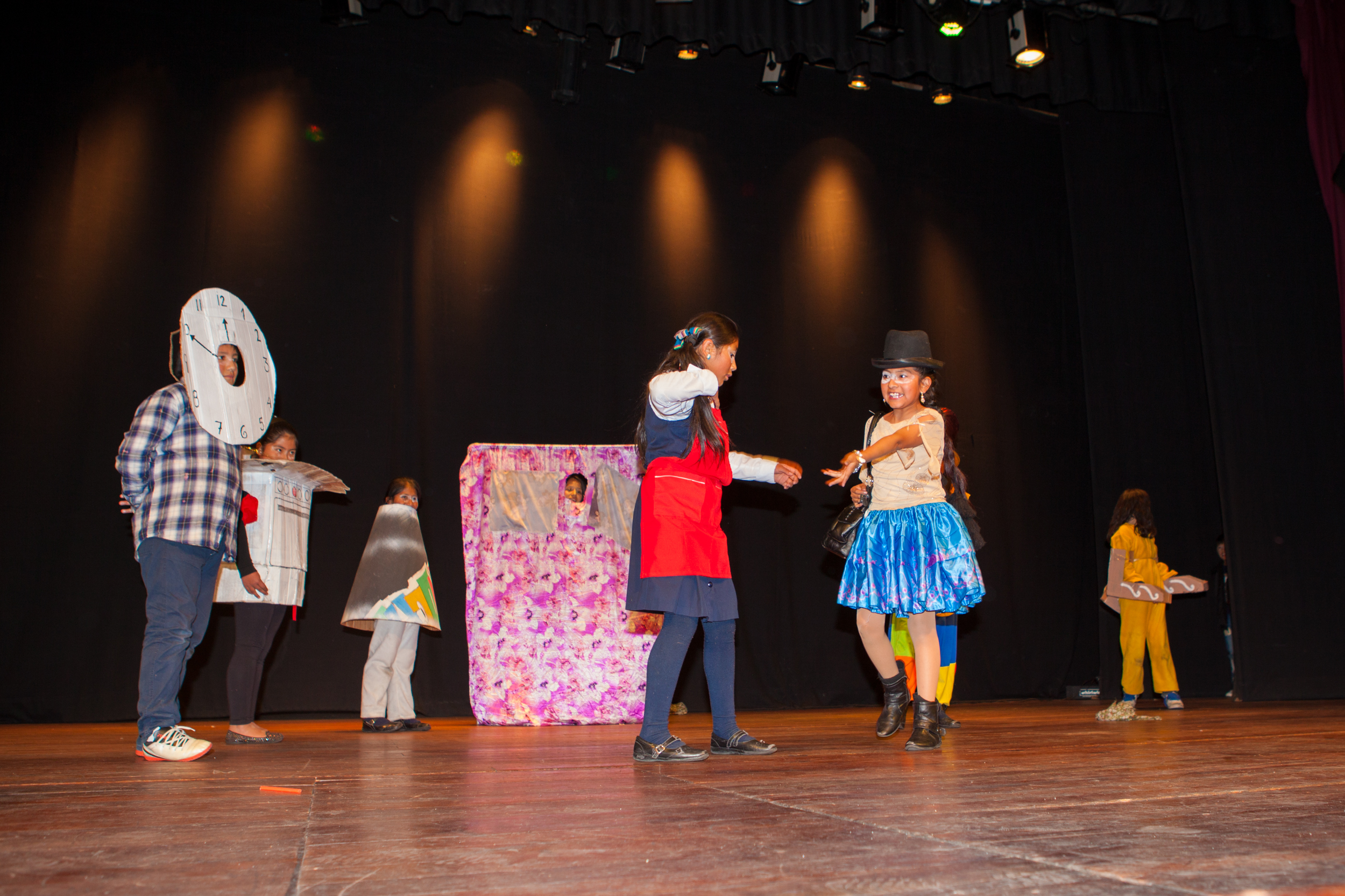 Más de 100 niñas, niños y adolescentes se dieron cita el miércoles 19 de junio en el escenario del Teatro Municipal Alberto Saavedra Pérez en La Paz para protagonizar su obra de creación colectiva “María y Andrés en un día al Revés”.